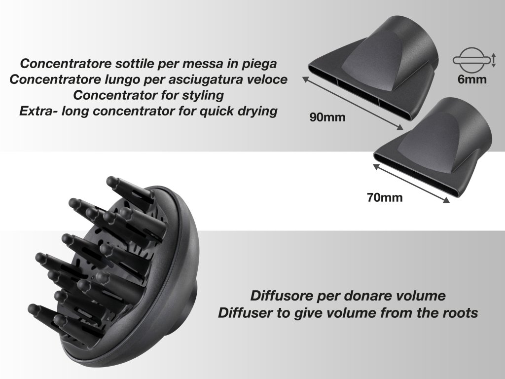 - 2 koncentrátory (7 a 9 mm) pro dokonalý styling