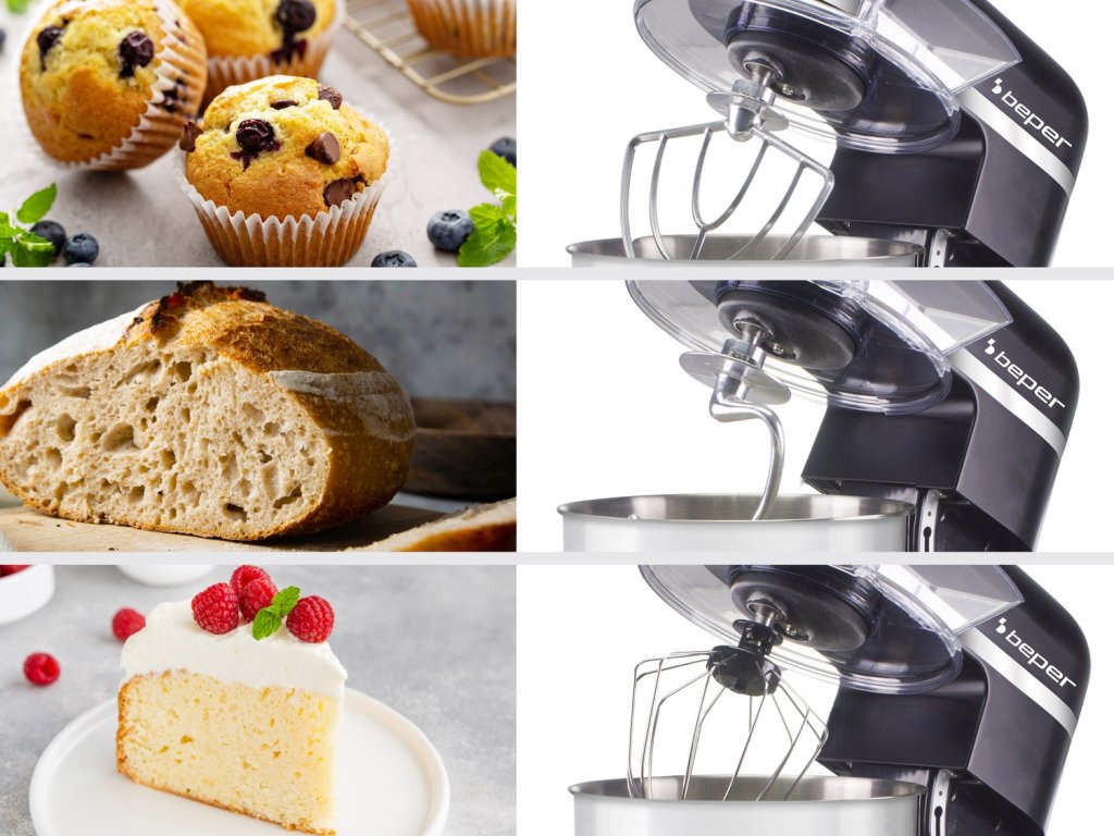 Opatřen krytem proti rozstřiku a 3 doplňky pro mixování různých druhů potravin: drátěnou šlehací metličkou z nerezové oceli pro šlehání a míchání měkkých těst, šlehačem pro rovnoměrné promíchání těsta hákem na hutnější těsto pro přípravu chleba a pizzy.