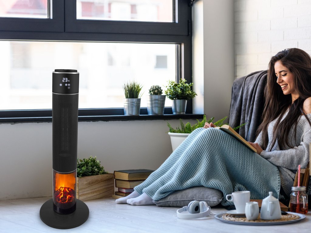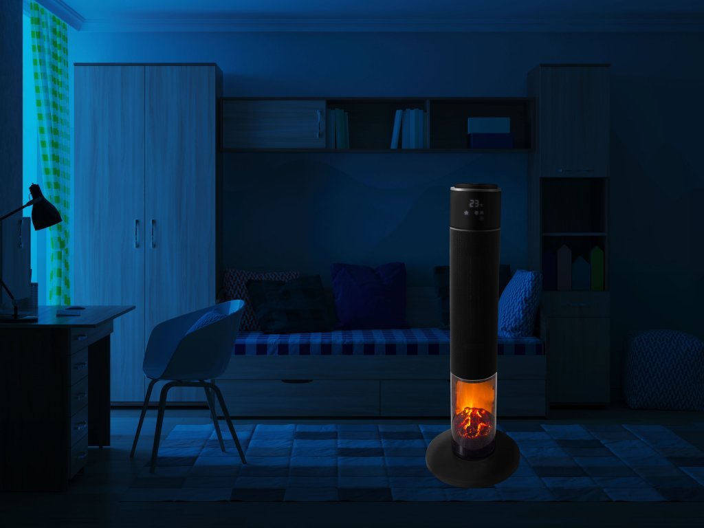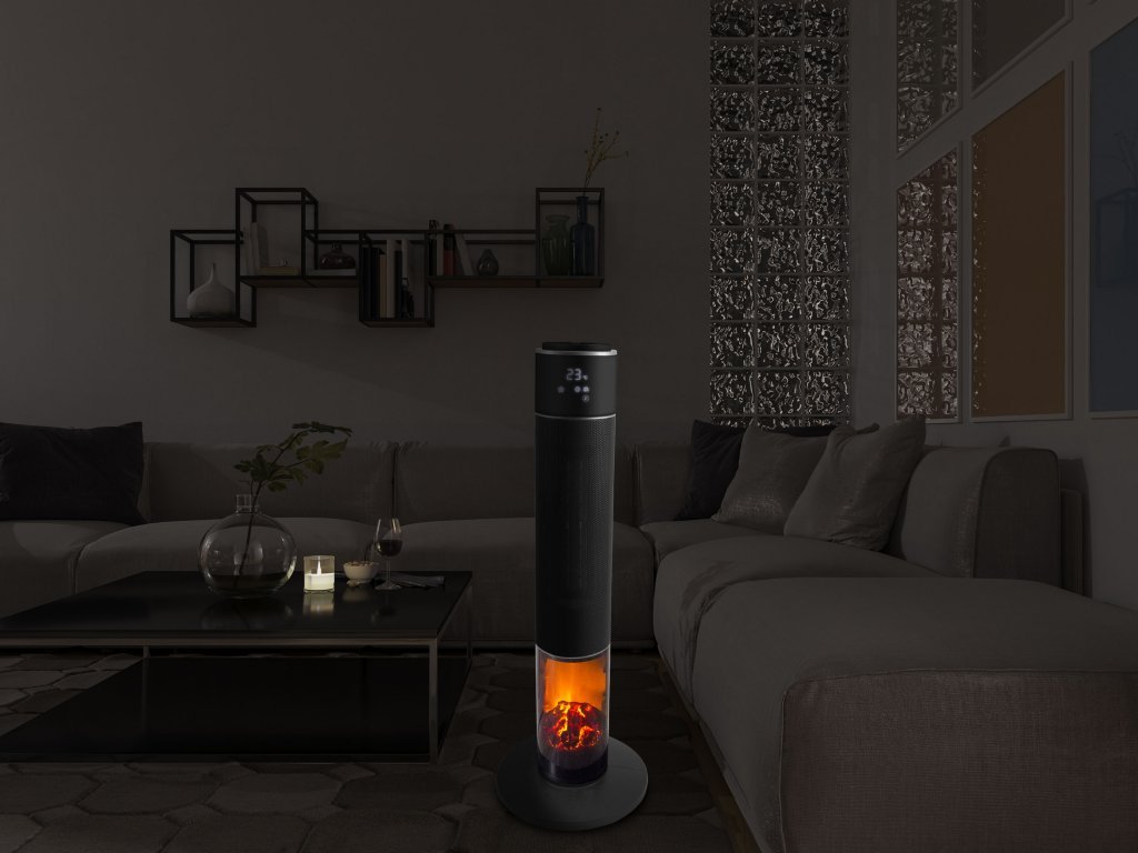 Elegantní věžový horkovzdušný ventilátor s keramickými topnými tělesy se silným výhřevným účinkem a nízkou spotřebou je vybaven dotykovým ovládacím panelem, dálkovým ovládáním a časovačem nastavitelným až na 8 hodin. LED světlo s efektem plamene vnese teplo a útulnost do každé místnosti.