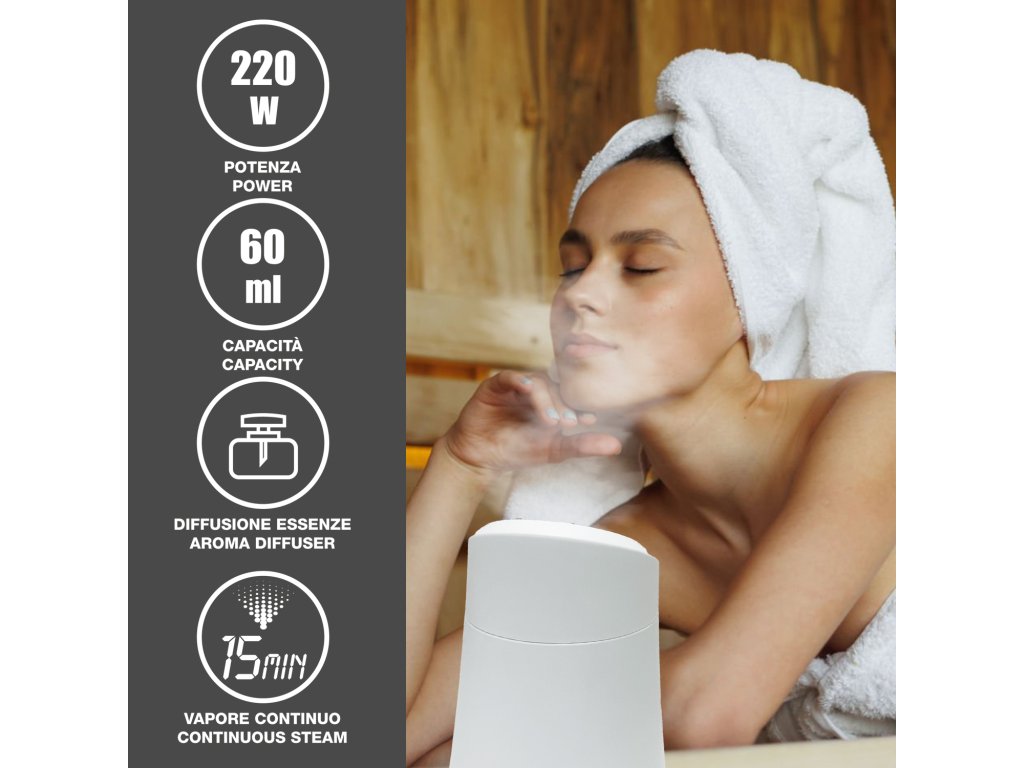 Obličejová sauna poskytuje intenzivní hydrataci a hloubkové čištění pleti. Je vybavena vnitřním zásobníkem na vodu o objemu 60 ml a nádobkou na vonné esence, která promění péči o pleť v příjemný aromaterapeutický zážitek. Pro bezpečné a pohodlné používání nechybí kontrolka provozu, protiskluzové nožičky pro stabilitu a funkce automatického vypnutí s ochranou proti přehřátí.