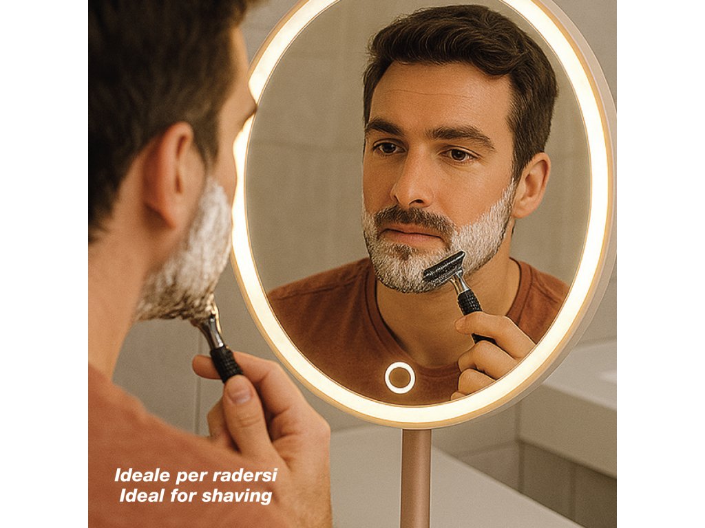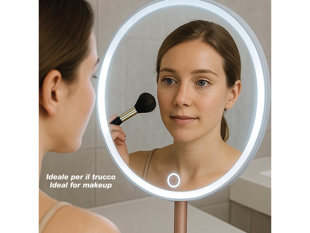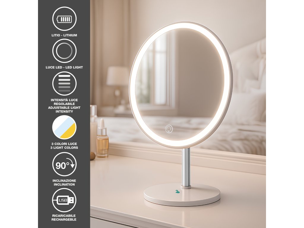 Zrcátko je vybaveno dotykovým ovládáním a nastavitelnou intenzitou světla, takže si vždy nastavíte ideální jas. Stabilní základna zajišťuje bezpečné používání a možnost náklonu až o 90° umožňuje maximální komfort při každém použití.