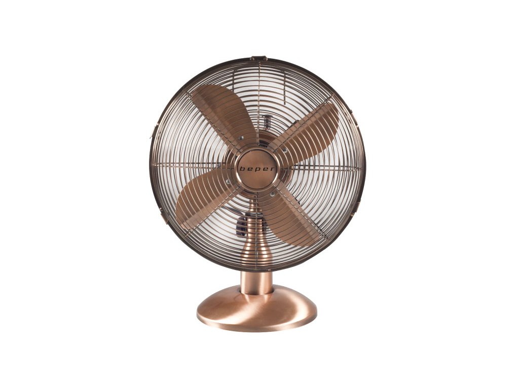 Retro stolní ventilátor s měděným designem, 4 hliníkovými lopatkami a O 30 cm ochrannou mřížkou. Nastavitelné 3 rychlosti a funkce automatické oscilace. Díky protiskluzovému povrchu podstavce je možné jej umístit na jakýkoli povrch. Ideální pro retro milovníky designu.