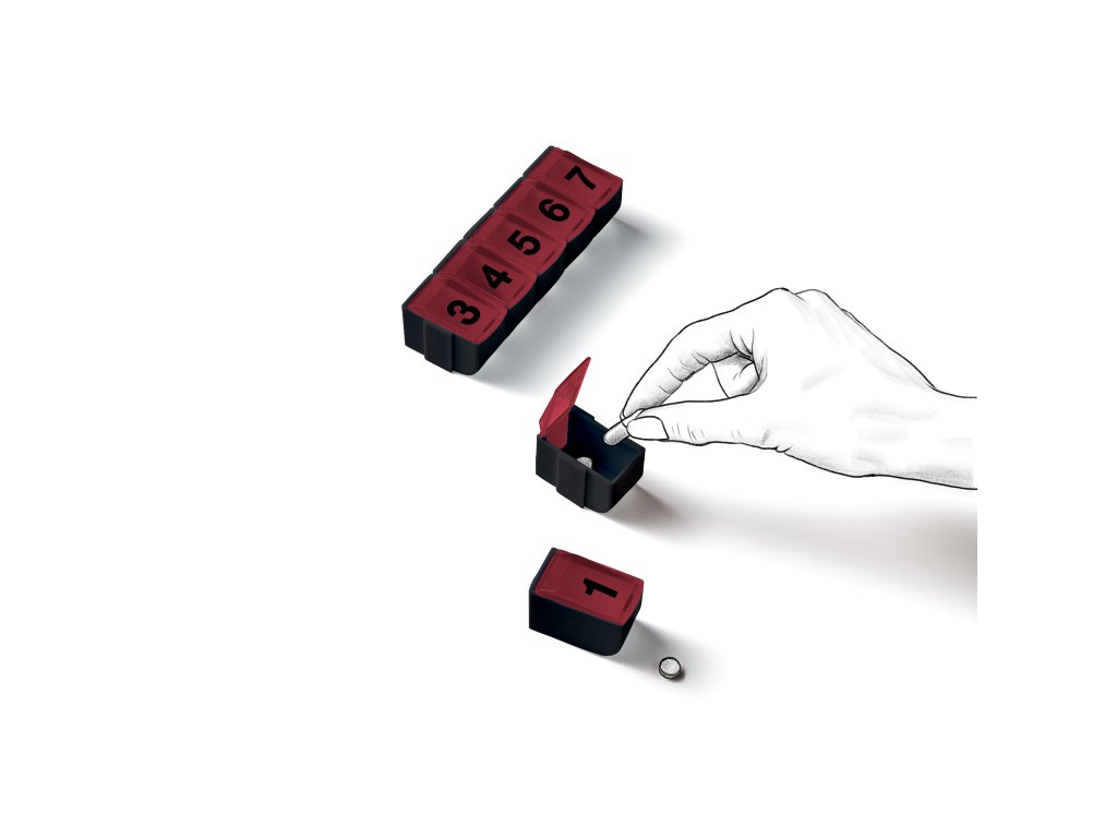 Krabička obsahuje sedm očíslovaných oddílů, které lze zasunout a vysunout, což umožňuje vzít si s sebou jen jeden nebo několik oddílů. Sedm přihrádek umožňuje rozdělit léky na jednotlivé dny v týdnu.