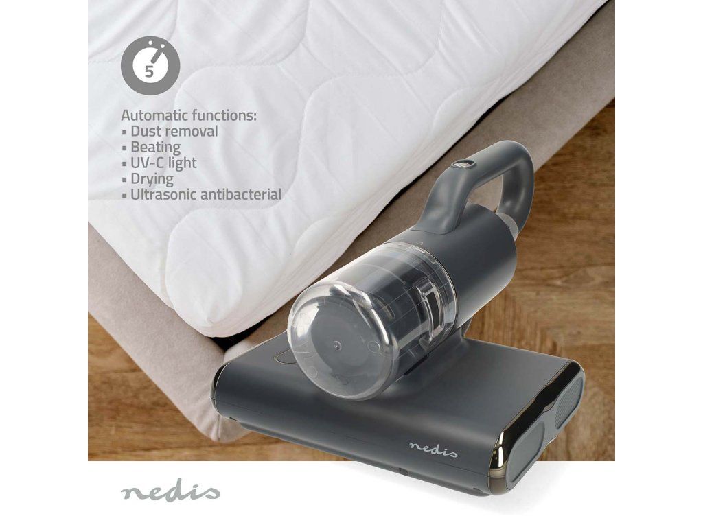 Ultrazvukový vysavač matrací Nedis je vybaven pěti automatickými režimy čištění, které zajistí důkladné vyčištění na jeden zátah. Odstraňuje prach a nečistoty, tluče do tkaniny, aby uvolnil částice, využívá UV-C světlo k odstranění bakterií a alergenů, používá jemnou ultrazvukovou antibakteriální technologii a dokonce poskytuje funkci sušení pro větší hygienu. Tyto integrované funkce spolupracují na dezinfekci a osvěžení vašich tkanin s minimálním úsilím.