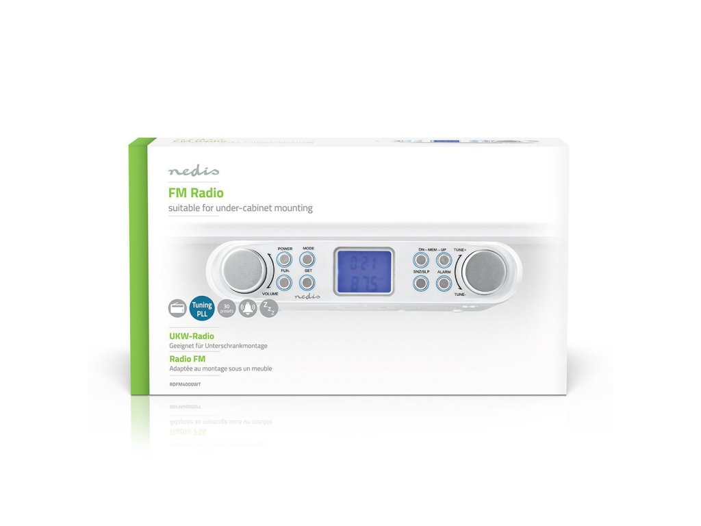 Nedis RDFM4000WT FM rádio pod kuchyňskou linku, 30 předvoleb, displej s automatickým stmíváním, bílá