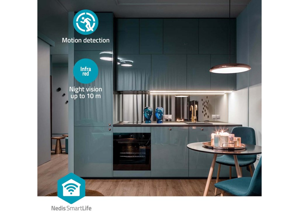 Nedis® SmartLife™ chytrá IP kamera z řady Nedis® Smart Home s Full HD rozlišením je snadno ovladatelná dětská chůvička/IP kamera pro vnitřní použití, kterou lze jednoduše připojit k Wi-Fi síti a sledovat např. Vaše miminko. Můžete zaznamenávat jakýkoli zvuk nebo pohyb. Nahrávky lze pořizovat nepřetržitě, podle rozvrhu nebo lze nahrávání spouštět pohybem či zvukem. Kameru můžete pomocí bezplatné aplikace v telefonu horizontálně i vertikálně otáčet nebo ji nechat automaticky sledovat jakýkoli pohyb, aby vám nic neuniklo. Díky přívětivému designu se toto zařízení stane vítaným doplňkem a infračervená LED dioda zajistí noční vidění až do vzdálenosti 10 metrů bez nutnosti použití viditelného světla. Integrovaný snímač teploty a vlhkosti v místnosti zobrazuje oba údaje v aplikaci. Sledujte, poslouchejte a mluvte s kýmkoli, kdo je před kamerou, nebo sledujte záznamy uložené na kartě microSD (není součástí balení) nebo v cloudu (na základě předplatného). Pokud je detekce pohybu vypnutá, můžete zasílat upozornění pouhým stisknutím tlačítka na přední straně kamery.