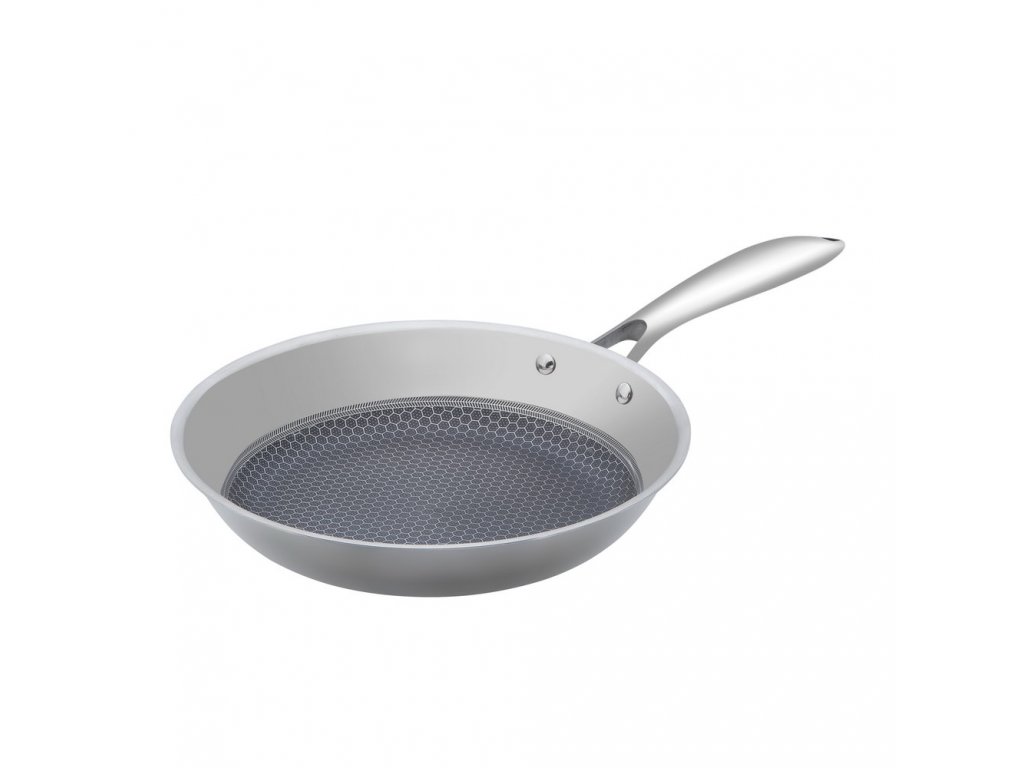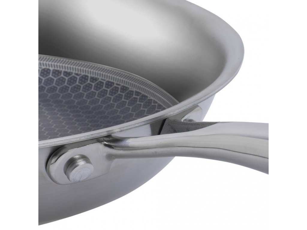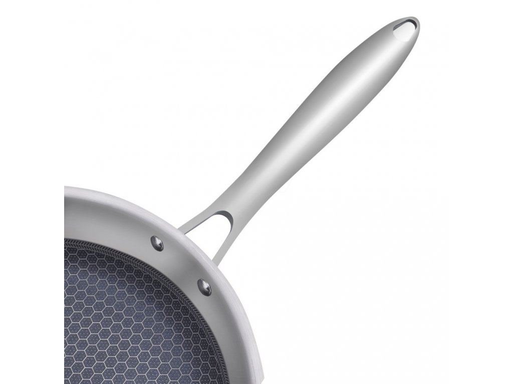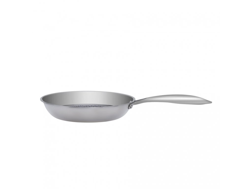 Povrchová úprava "včelí plástve" na vnitřní straně pánve z nerezové oceli zajišťuje odolnost proti přilepení a nikdy nereaguje s jídlem. Nerezová ocel je ideálním povrchem pro vaření pro opékání, smažení a restování pokrmů, stejně jako k přípravě omáček. Plné hliníkové jádro o velkém rozměru se táhne napříč dnem a po stranách pánve pro nejlepší distribuci tepla.