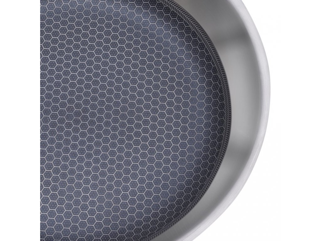 Struktura "včelí plástve" z nerezové oceli chrání podkladovou nepřilnavou vrstvu, takže můžete tyto pánve bezpečně používat s jakýmkoli nářadím, včetně kovových šlehačů, lžiček a špachtlí. Nepoškrábou nepřilnavý povrch. Nepřilnavý interiér vám umožní vařit s jistotou, aniž byste se museli obávat, že se jídlo přichytí.