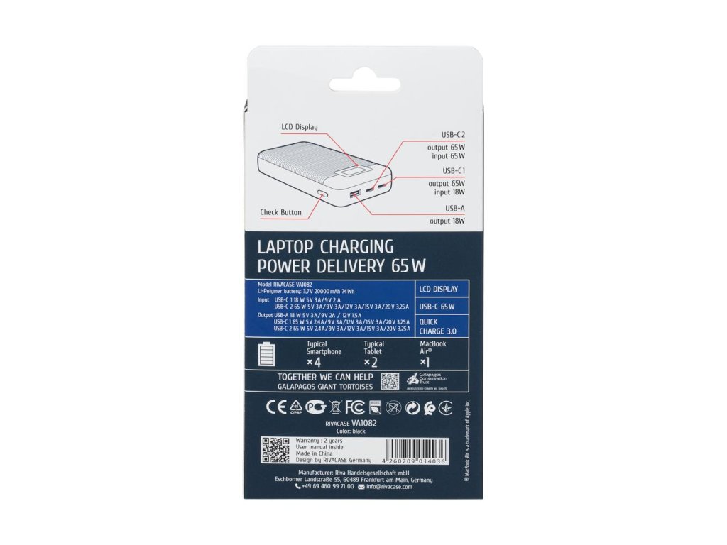 Riva Power VA1082 powerbanka 20000mAh PD 65W s LCD pro notebooky, černá