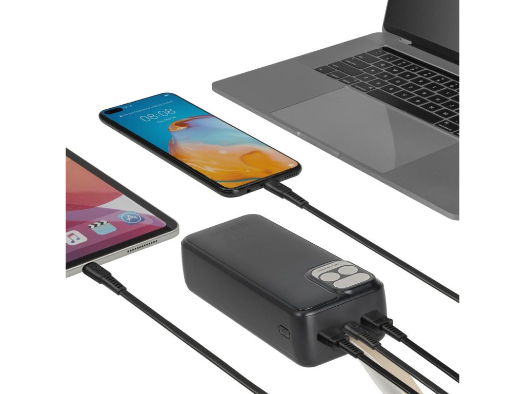 - Port USB-C s funkcí vstupu i výstupu – umožňuje nabíjet zařízení a zároveň dobíjet samotnou powerbanku