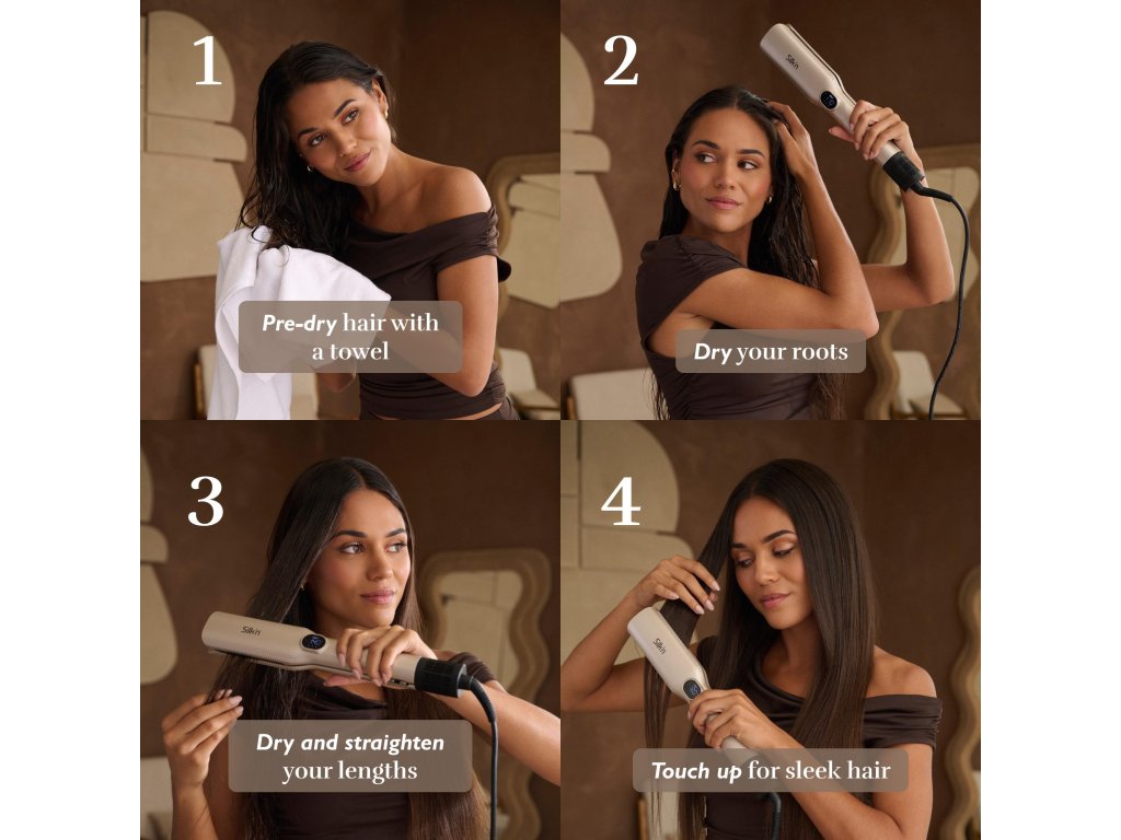 Wet-to-Dry Mode - když spěcháte. Styling vlhkých vlasů bez předchozího fénování: destičky na 110 °C až 160 °C v kombinaci s proudem vzduchu vysuší a upraví vlasy v jediném kroku. Na závěr studený vzduch pro uzamčení účesu.