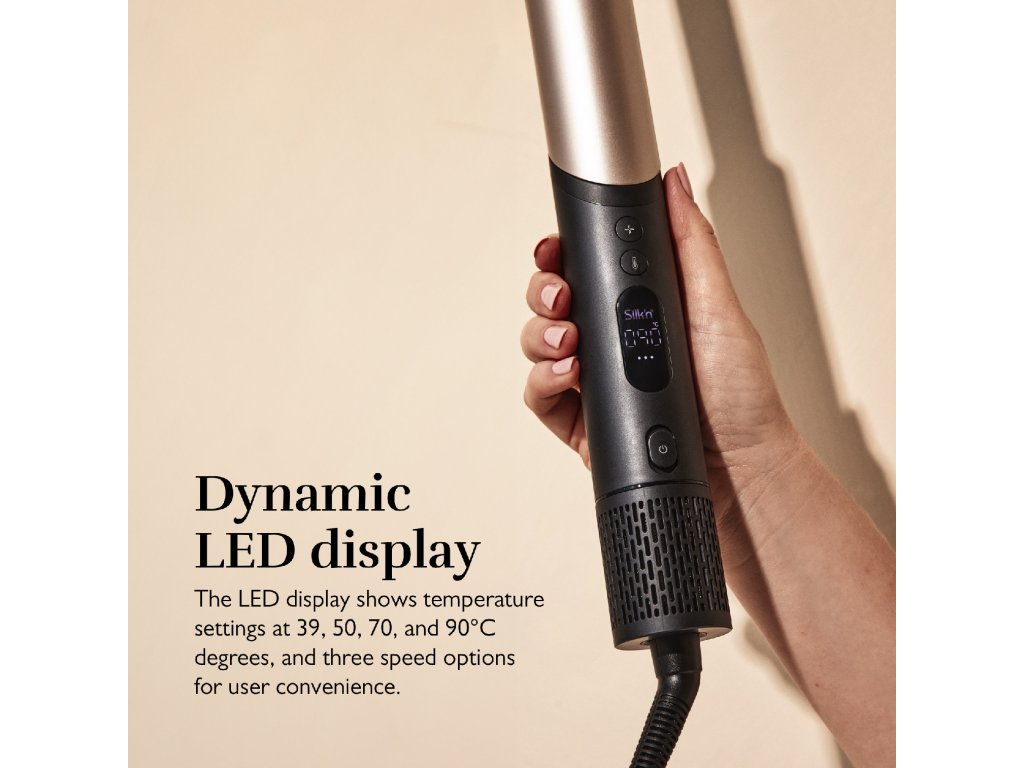 Vysoušeč SilkyAir Flex je vybaven dynamickým LED displejem, který vám zobrazí všechny potřebné informace. Tento přístroj má 4 teploty: 39 °C, 50 °C, 70 °C a 90 °C a 3 nastavení rychlosti, která se zobrazují na displeji. Zobrazí se na něm také funkce cool shot, kterou lze aktivovat stisknutím a podržením tlačítka teploty pro nastavení kadeří.