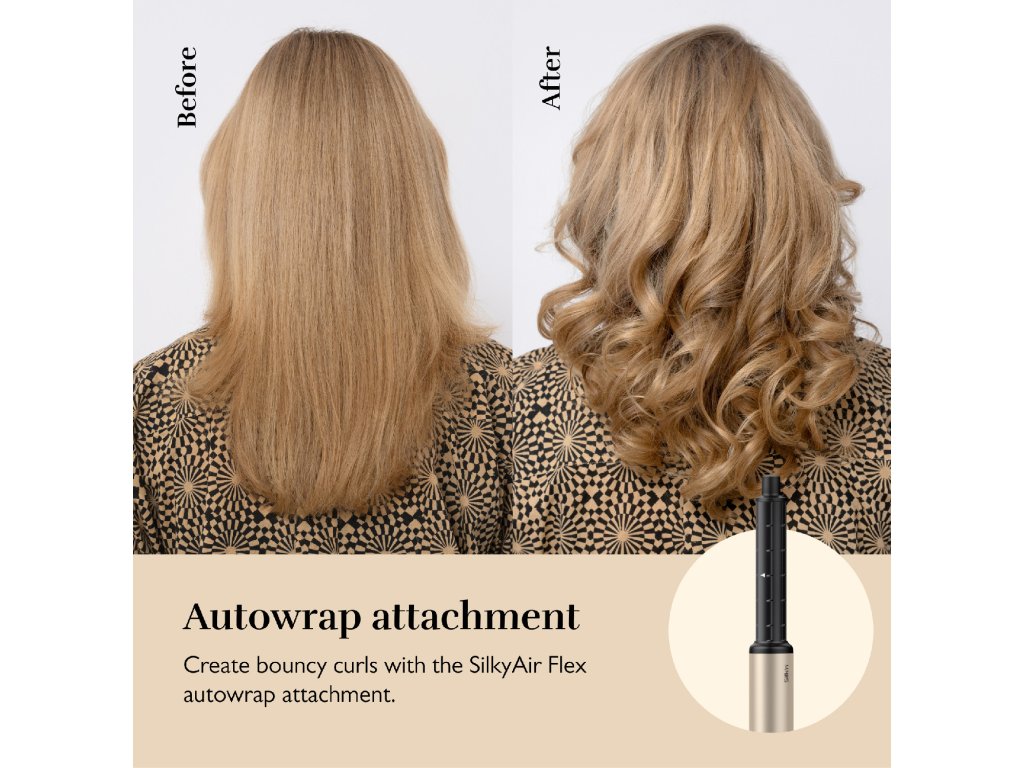 S nástavcem Autowrap snadno získáte definované lokny. Náš inovativní proud vzduchu automaticky obtočí vaše vlasy kolem hlavně. Proud vzduchu je rozdělen rovnoměrně, takže vlasy jsou vysušeny přirozenějším způsobem a vytváří krásné lokny. Poté si lokny zafixujte pomocí funkce cool shot pro trvalejší výsledek. Součástí kulmy SilkyAir Flex jsou 2 nástavce pro vytvoření loken na pravé i levé straně.